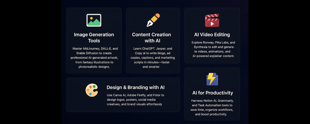 Generative AI Tools – Create images, videos, and graphics using platforms like Midjourney, DALL·E, Runway, and Stable Diffusion.